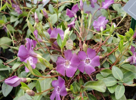 Vinca - Maagdenpalm. Dit zijn altijdgroene, kruipende struikjes, die het in iedere normale tuingrond doen, zelfs op schaduwrijke plaatsen. Zeer geschikt om op grote oppervlakten te gebruiken, indien men weinig onderhoud wenst.
