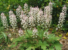 Tiarella - Perzische muts/Schuimbloem. Tiarella doet het zeer goed op halfbeschaduwde plaatsen in een losse humusrijke grond. Uitstekende bodembedekker die al gauw een heel tapijt vormt.